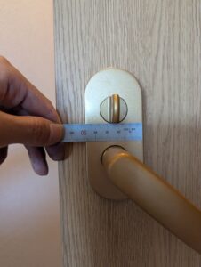 そこで、ラッチ錠のフロントプレートサイズとBS(バックセット)、表示錠の縦、横のサイズを測り取り付けられそうな代替品を探したところ、加工はもちろん必要ですが、長沢製作所のTXSー1K42(GT色)BS51mm小判座表示錠が取り付けられそうな感じ。